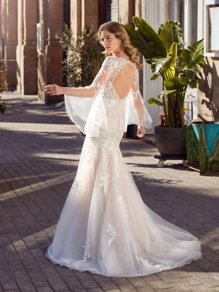Un vestido de novia sirena ultra romántico de encaje y tul. Con hermosas mangas «belle», bordados en la parte superior del cuerpo y hermosas aplicaciones florales en la falda. La espalda en forma de ojo de cerradura se cierra con botones de sastrería y el escote corazón se sujeta con varillas interiores y copas push-up.